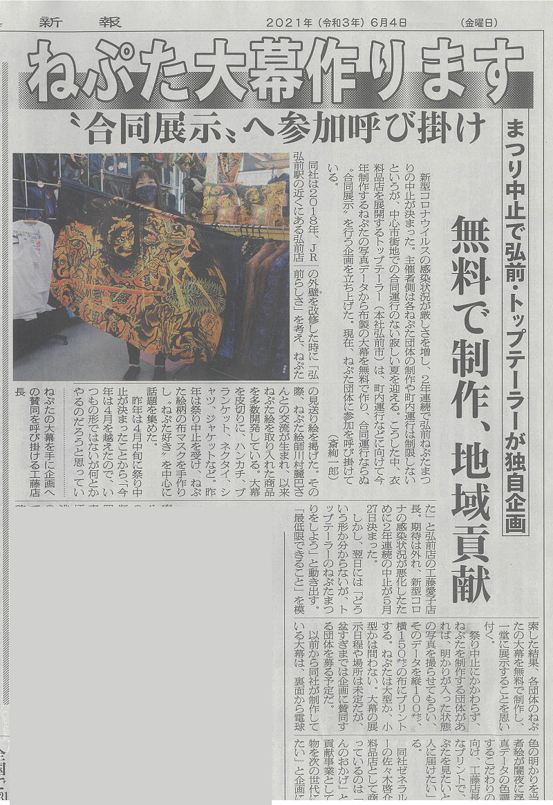ねぷた大幕つくります! 町内運行などにむけて今年製作するねぷたの写真データから、布製の大膜を無料で作り、合同運行ならぬ合同展示を行う企画を立ち上げました。(令和3年6月4日 陸奥新報) 投稿ナビゲーション ねぷた屋さんより、ねぷたマスクのご案内です 令和3年の弘前ねぷたまつりは中止となりました。